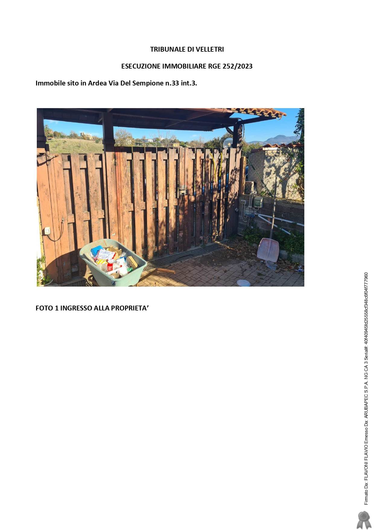 fabbricato residenziale ubicato a ardea (rm) - via del sempione n.33, piano s1-t-1 in quadrifamiliare. al piano seminterrato: soggiorno con angolo cottura, tre camere, un bagno e ripostiglio; al piano terra rialzato: soggiorno con angolo cottura, due portici e terrazzo; al piano primo: tre camere, un bagno e balcone. esternamente gode in modo esclusivo, senza averne la titolarità, di una porzione di giardino censita come bene comune a tutte le unità immobiliari che costituiscono la quadrifamiliare.